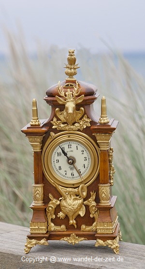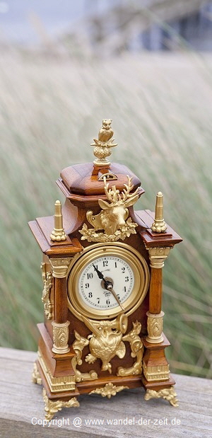 Die Uhr bezieht sich auf den heiligen Hubertus, der als der Schutzpatron der waidgerechten Jagd galt. Die Uhr ist, mit Eule, nur 30 cm hoch, wirkt aber viel kleiner. Es gibt Varianten, da die Uhren einzeln angefertigt wurden. Manche haben ein spitz zulaufendes Dach, manche überhaupt kein Dach, andere haben diesen stilisierten Schornstein. Sie sind sehr rar, nur eine Hand voll hat die Weltkriege überlebt.